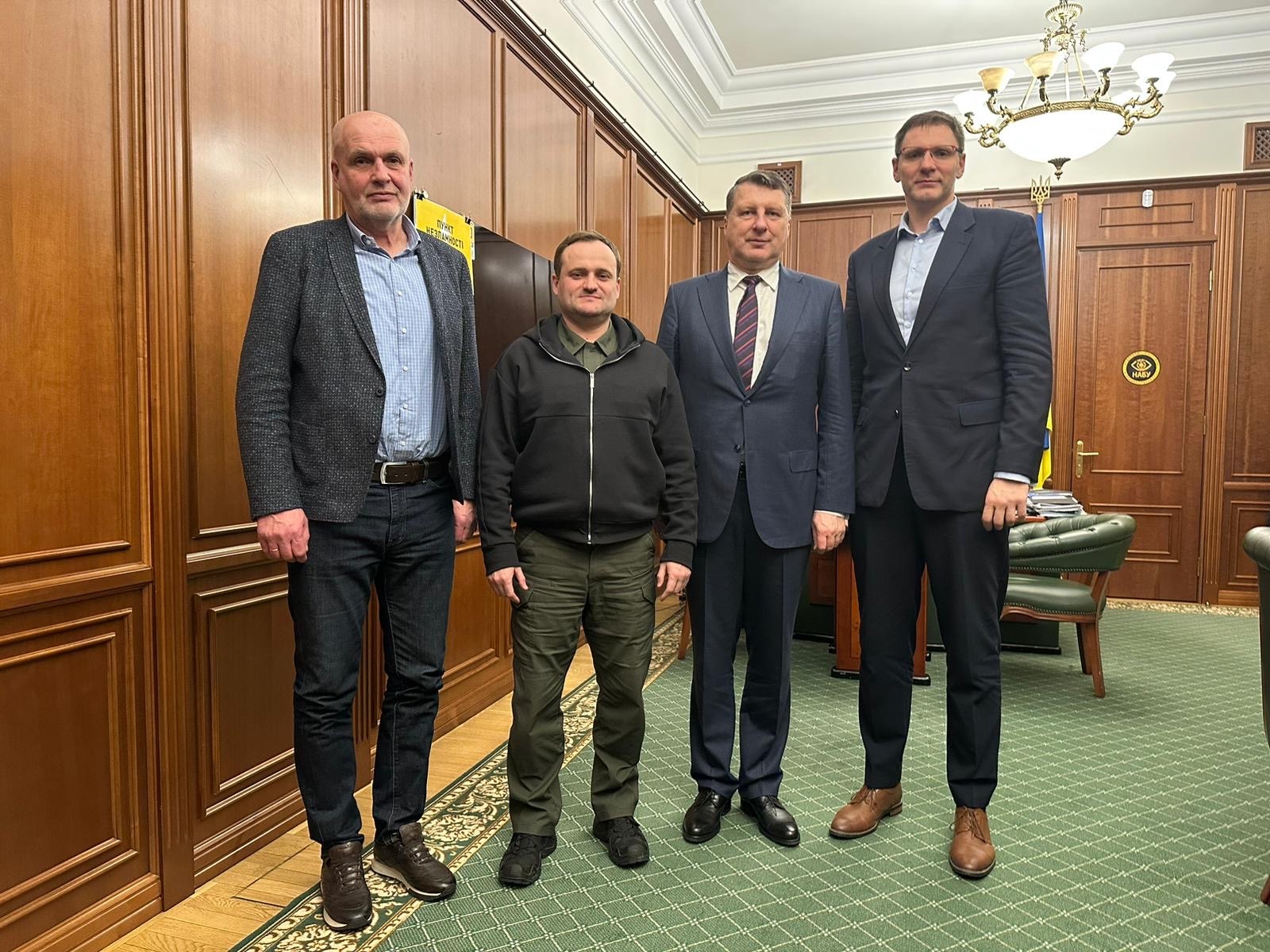 Attēlā no kreisās: Ukrainas Basketbola federācijas ģenerālsekretārs Volodimirs Drabikovskis, Ukrainas prezidenta administrācijas biroja vadītāja vietnieks Oleksijs Kuļeba, LBS prezidents Raimonds Vējonis un LBS ģenerālsekretārs Kaspars Cipruss